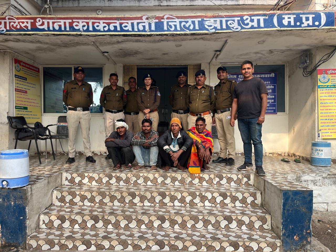 झाबुआ। झाबुआ पुलिस कप्तान श्रीमान पुलिस अधीक्षक महोदय श्री शिवदयाल सिंह के द्वारा जिले के समस्त थानो में अभियान चलाये जाने तथा गुण्डा/निगरानी बदमाश की चैकिंग एवं स्थाई वारंटी धरपकड करने हेतु निर्देशित करने पर श्रीमान अतिरिक्त पुलिस अधीक्षक महोदय श्री प्रतिपालसिंह महोबिया व अनुविभागीय अधिकारी (पुलिस) राजेश सुलिया के मार्गदर्शन में थाना प्रभारी काकनवानी थाना काकनवानी के नेतृत्व में माननीय न्यायालय थांदला के RCT/नं./528/2020 अपराध क्रं.167/2020 धारा 294,323,506,325,34 भादवि के फरार चल रहे (1.)स्थाई वारंटी वालसिंग पिता समसु डामोर 45 साल निवासी पलासडोर, (2.)स्थाई वारंटी अल्लु उर्फ कालु पिता बच्चु मावी उम्र 25 साल निवासी पलासडोर एवं RCT/नं./1065/2024 अपराध क्रं.239/2024 धारा 331(4),305 BNS के फरार चल रहे, (3.)स्थाई वारंटी जोसिंग पिता लखजी मुणिया उम्र 34 साल निवासी अलीपुरा, एवं RCT/नं./594/2021 अपराध क्रं.267/2021 धारा 294,323,506,325 भादवि के फरार चल रहे (4.)स्थाई वारंटी तोलिया पिता दल्ला वसुनिया उम्र 35 साल निवासी उमरादरा किकलवेरी फलिया को मुखबिर की सूचना एवं घेराबंदी कर पकडा गया व माननीय न्यायालय थांदला के समक्ष पेश किया गया है।