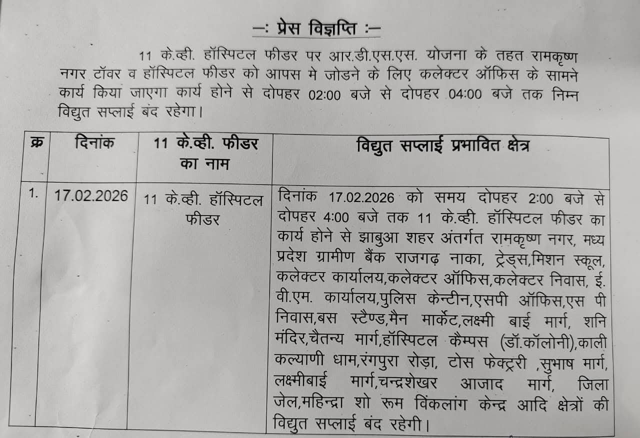झाबुआ। 11 के.व्ही. हॉस्पिटल फीडर पर आर.डी.एस.एस. योजना के तहत रामकृष्ण नगर टॉवर एवं हॉस्पिटल फीडर को आपस में जोड़ने हेतु कलेक्टर कार्यालय के सामने आवश्यक कार्य किया जाएगा। उक्त कार्य के कारण 17 फरवरी 2026 को दोपहर 02:00 बजे से दोपहर 04:00 बजे तक विद्युत आपूर्ति बाधित रहेगी।